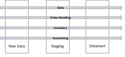 Information streams are flows of data through a data architecture that are strongly connected. For instance, such an information stream would flow horizontally through a standard data warehouse architecture having vertical layers that extract, transforms and loads data. Typically, these would incorporate components of major business processes of sales, order handling, inventory, accounting and so forth. The figure below displays this: